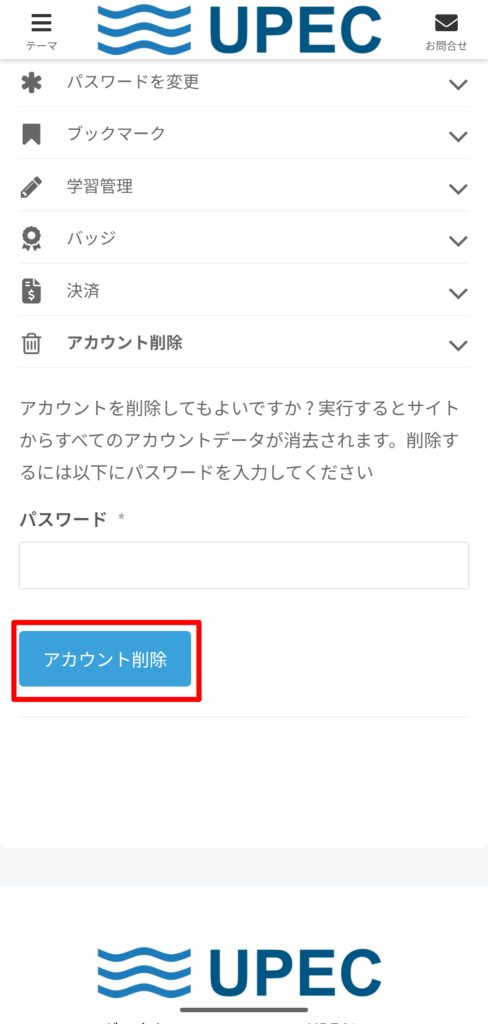 マイページ「アカウント削除」タブよりパスワードを入力後、「アカウント削除」を選択してください。